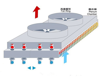 空氣冷卻器簡(jiǎn)稱空冷器,以空氣作為冷卻劑,可用作冷卻器,也可用作冷凝器??绽淦髦饕晒苁?、支架和風(fēng)機(jī)組成??諝饫鋮s器熱流體在管內(nèi)流動(dòng),空氣在管束外吹過。由于換熱所需的通風(fēng)量很大,而風(fēng)壓不高,故多采用軸流式通風(fēng)機(jī)。